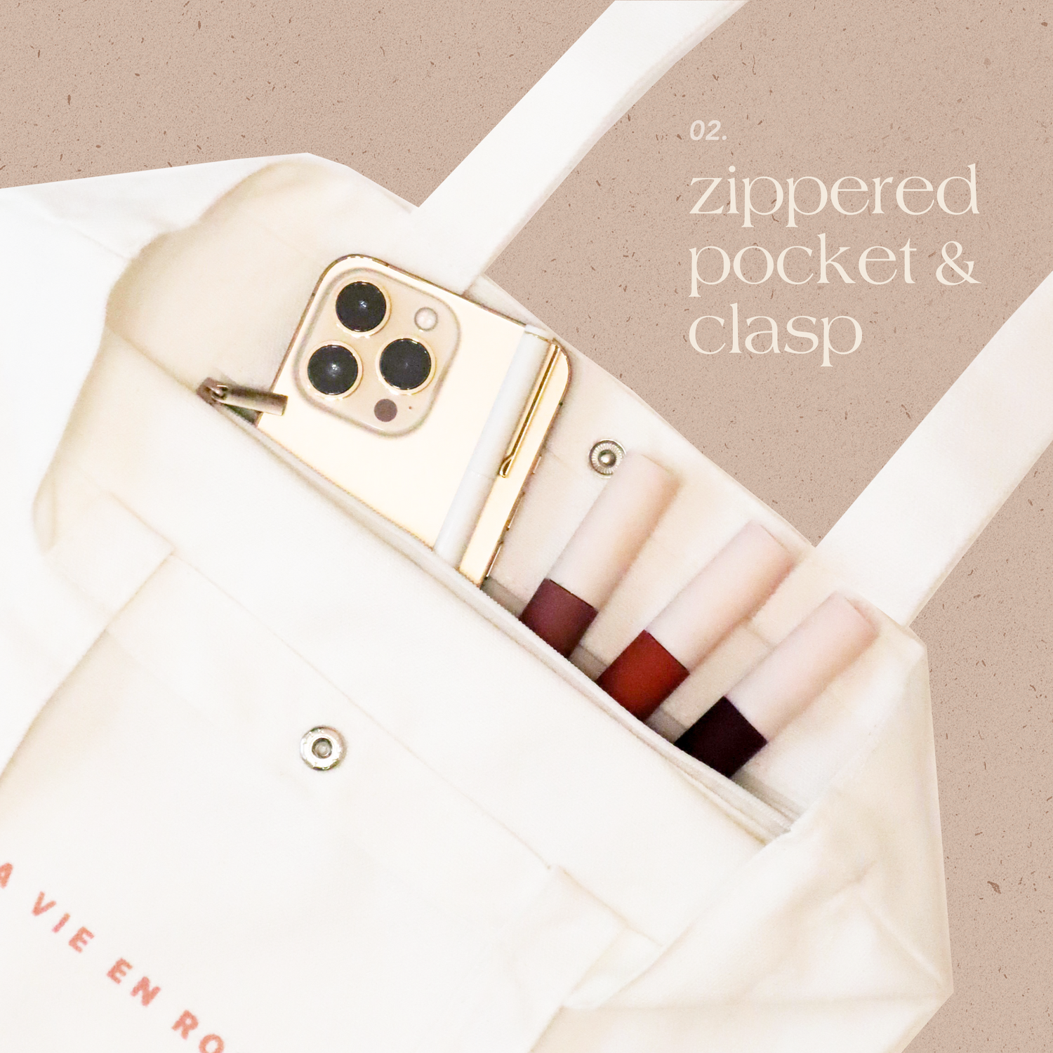 La Vie en Rose Canvas Tote Bag with Pocket (White)